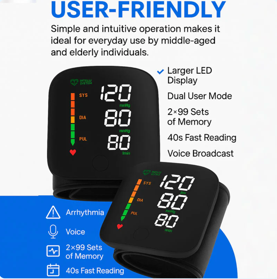 With advanced health tracking, a smart wrist blood pressure monitor doesn’t just give you a single reading — it logs trends, detects patterns, and syncs data to apps so you can monitor changes, set goals, and share detailed reports with your healthcare provider for smarter, proactive health management.